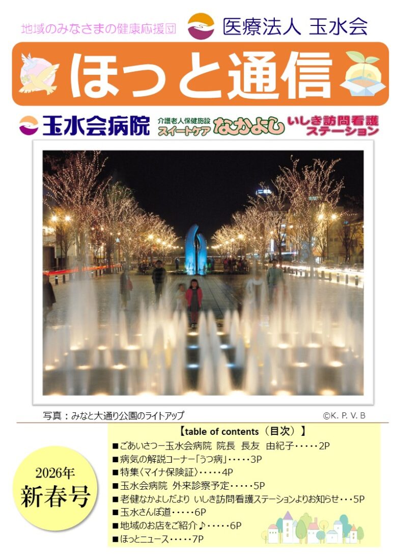 玉水会病院 -gyokusuikai hospital- ホーム お知らせ ほっと通信2026年新春号 ほっと通信2026年新春号 医療法人玉水会が発行している広報誌「ほっと通信」の2026年新春号が発行されました。ぜひご一読ください。 ほっと通信_2026年新春号ダウンロード « 前のページ 次のページ »