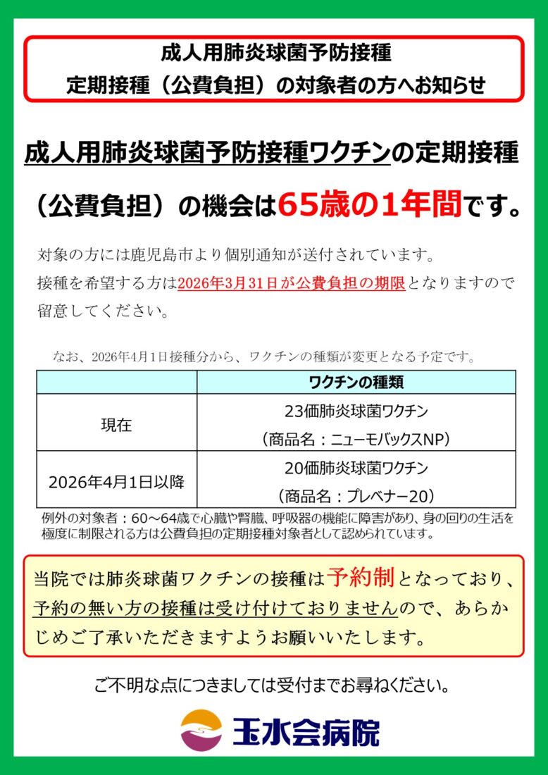 成人用肺炎球菌予防接種ワクチンのお知らせ