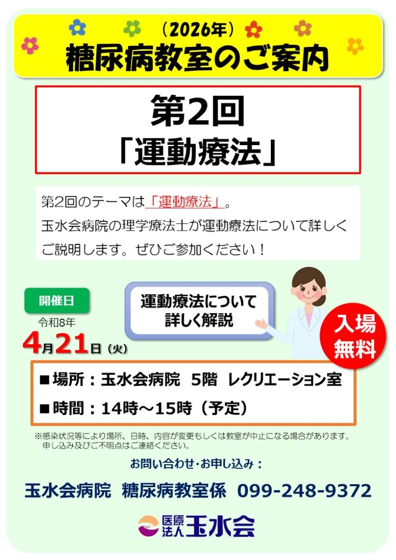 現在玉水会病院では糖尿病教室が行われていますが、講義内容の順番に変更がありますのでお知らせいたします。
